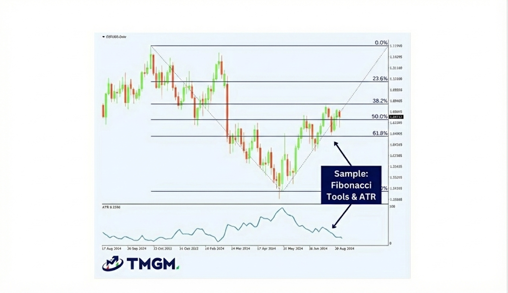 Fibonacci retracement levels help traders identify potential areas of support and resistance where a price correction might end and the original trend resume. In this example, these levels are paired with the Average True Range (ATR) indicator at the bottom, which measures market volatility. By combining these tools, a trader can identify a strategic entry point using Fibonacci levels and use the ATR value to set a stop-loss that accurately reflects current market conditions, rather than using an arbitrary number.