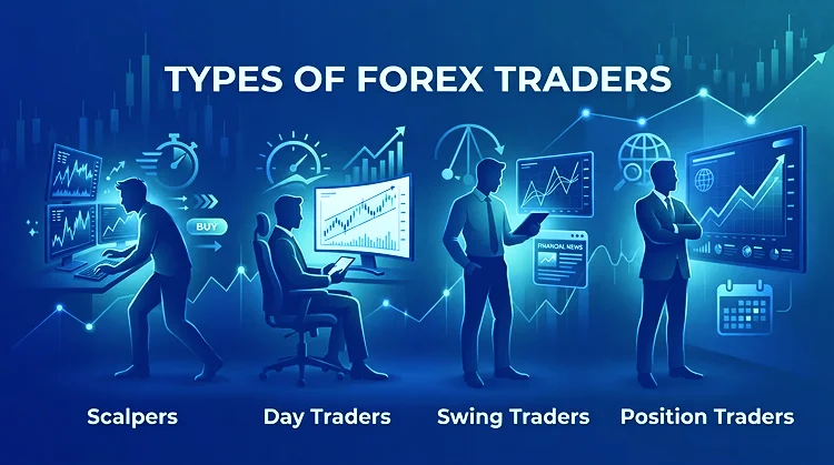 There are several types of forex traders, and each follows a different trading approach based on time, strategy, and market analysis methods.