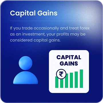 If you engage in forex trading only occasionally and treat it more like an investment rather than a regular activity, your profits may fall under capital gains. Depending on the duration for which you hold your position, these gains can be categorized as either short-term or long-term capital gains. Short-term gains are taxed at the normal tax rates, while long-term gains may be subject to a lower tax rate. This classification is more common among individuals who view forex trading in India as a means to diversify their portfolio, rather than as their primary source of income.