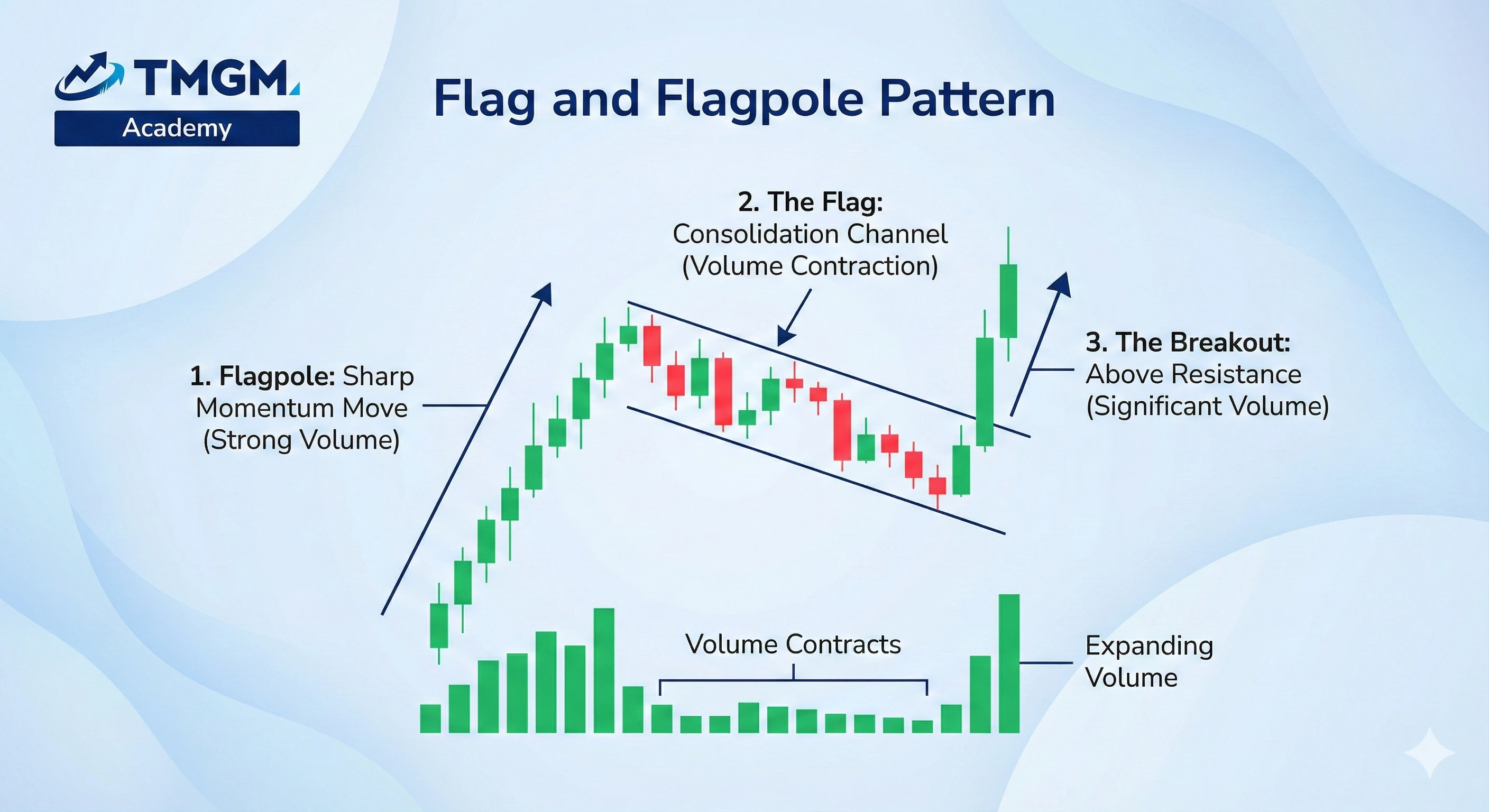 Three-part structure: Flagpole (Current Market Trend) → Flag (Temporary Consolidation) → Breakout.