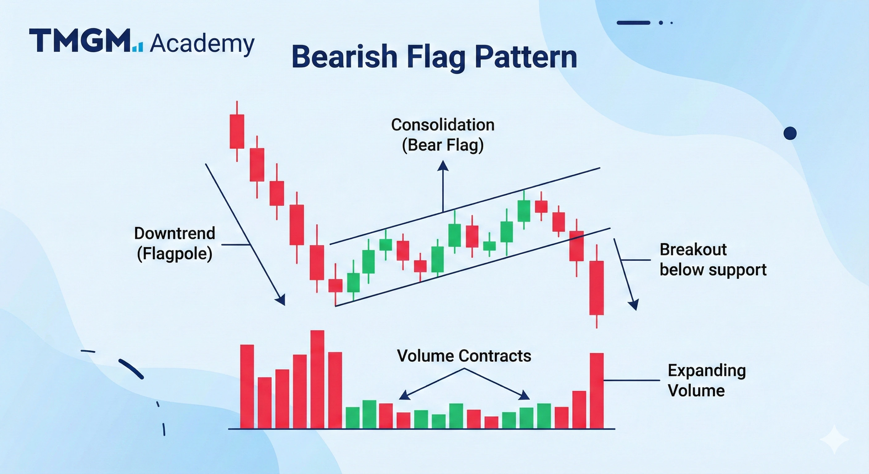 Flag patterns are continuation setups. They signal the prevailing trend will resume — not reverse.