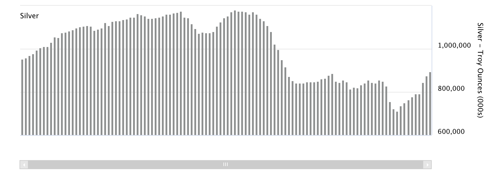 Figure: The data represents the volume of Loco London gold and silver held in the London vaults offering custodian services. Source: LBMA London Vault Data