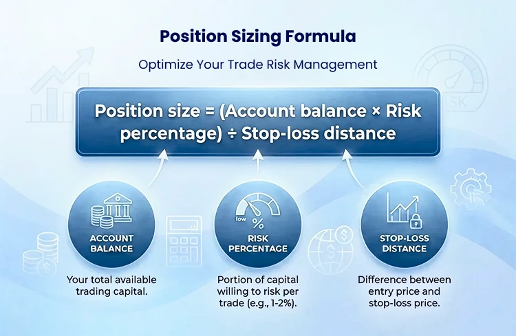 Position size = (Account balance × Risk percentage) ÷ Stop-loss distance