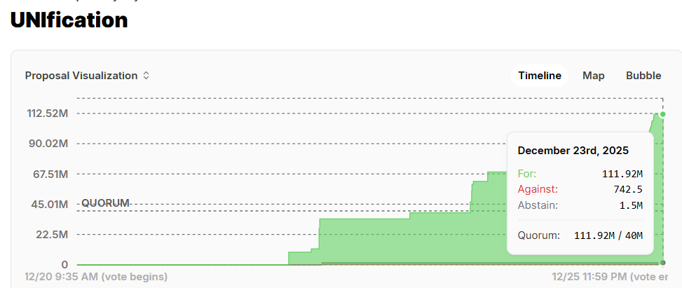 As of Tuesday, the proposal has already crossed the quorum threshold, as shown in the chart below, with more than 111 million UNI tokens voting in favor versus just 742 against, indicating strong community support. While voting remains open until Christmas, the wide margin suggests the outcome is effectively decided.