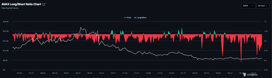 Avalanche’s long-to-short ratio reads 0.84 on Thursday, nearing the lowest level over a month. A ratio below 1 indicates bearish sentiment in the market, as traders are betting the asset’s price will fall.