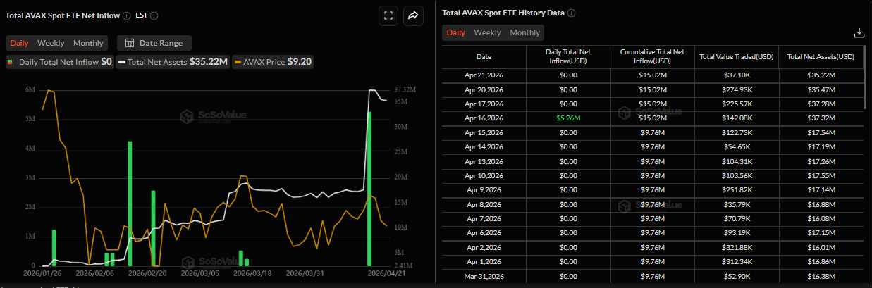 Institutional demand for AVAX remained muted so far this week, which has supported its price drop. SoSoValue data shows spot AVAX Exchange Traded Funds (ETFs) have remained silent so far this week, following a $5.26 million inflow last week. This indicates that institutional investors do not want to increase exposure to AVAX amid growing uncertainty in the Middle East.