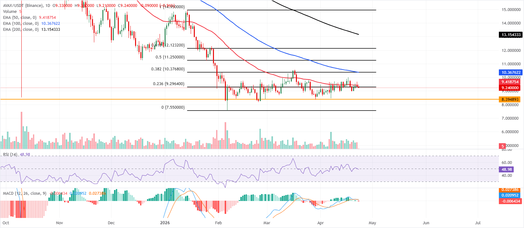 Avalanche price is trading at $9.35 on Thursday, keeping a bearish near-term bias as price holds beneath all the key Exponential Moving Averages (EMAs). The 50-day EMA at $9.41, together with the 100-day EMA at $10.36 and the 200-day EMA at $13.15, line up overhead as dynamic resistance, suggesting rallies are likely to be capped while the pair remains below this stack.