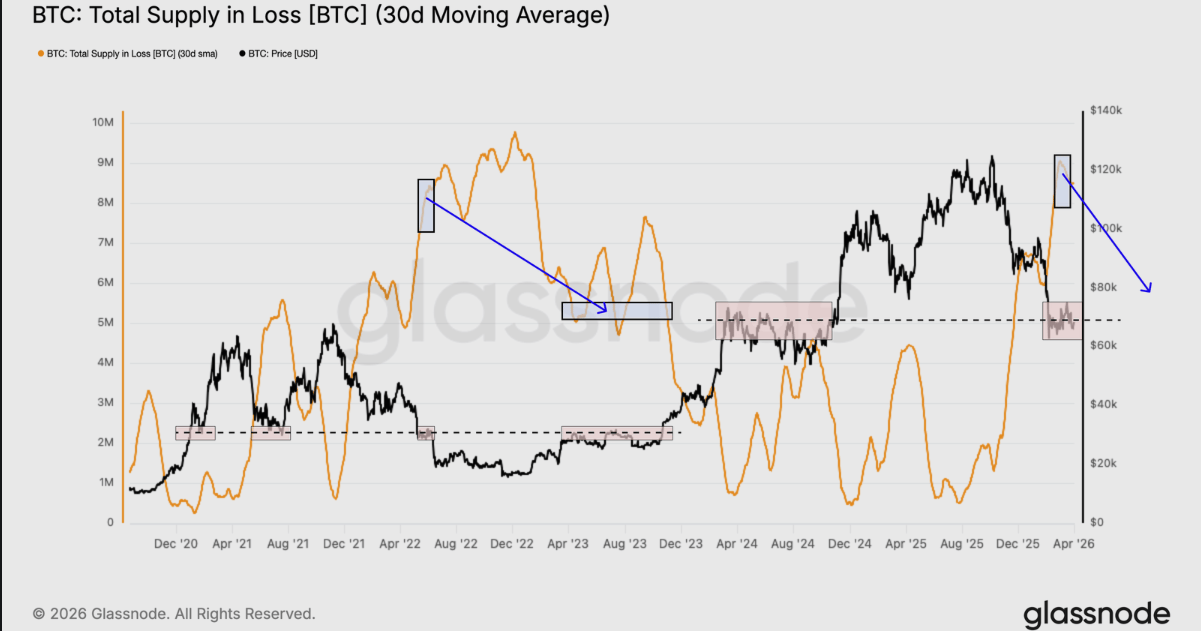 At the core of BTC's current trend is the Total Supply in Loss metric, which tracks the volume of BTC last moved at prices above the current market level.