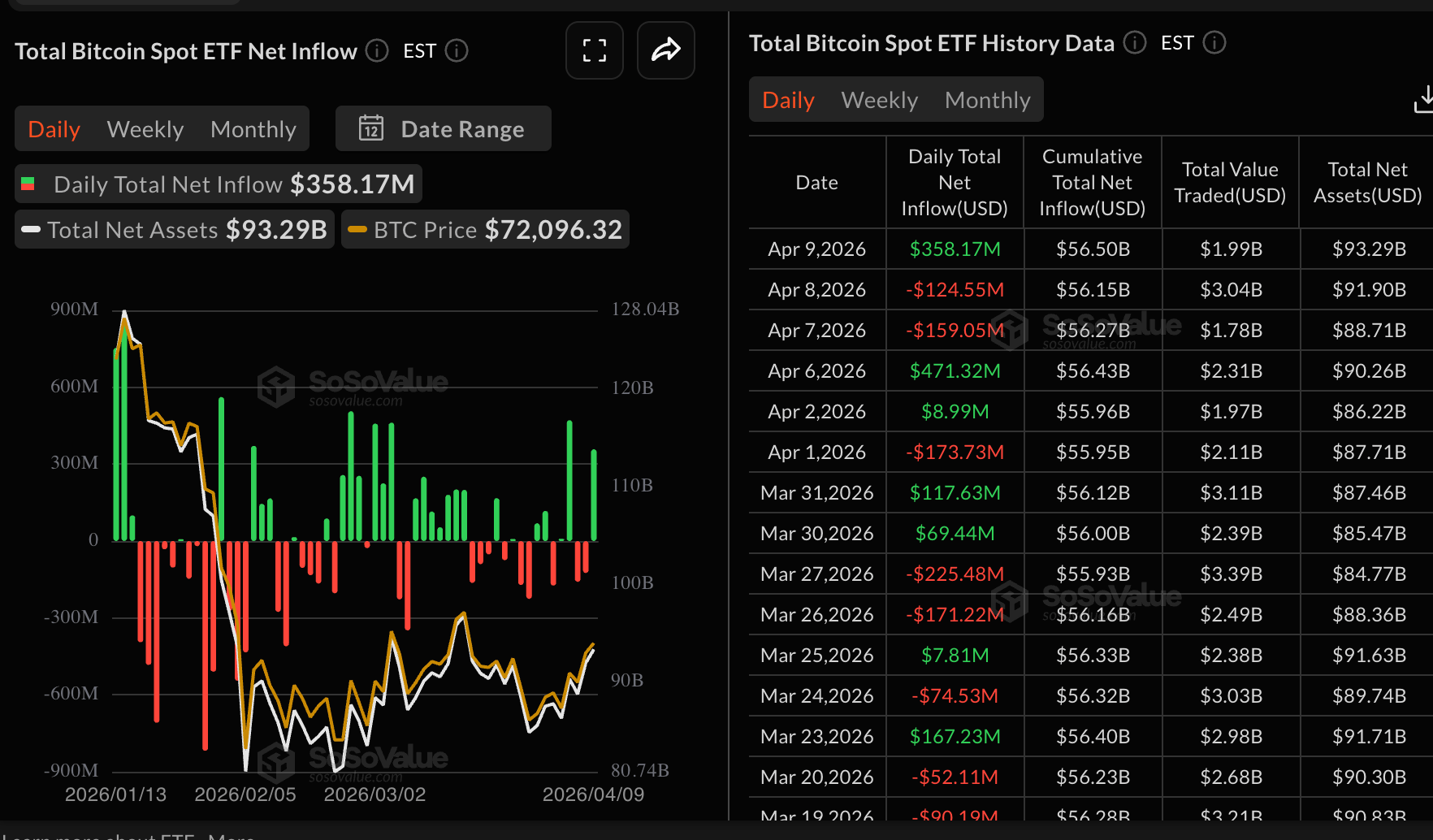 Interest in crypto investment products generally improved on Thursday, with inflows of roughly $358 million into Bitcoin spot Exchange-Traded Funds (ETFs). Cumulative inflows currently stand at $56.50 billion, with net assets under management averaging $93.29 billion.