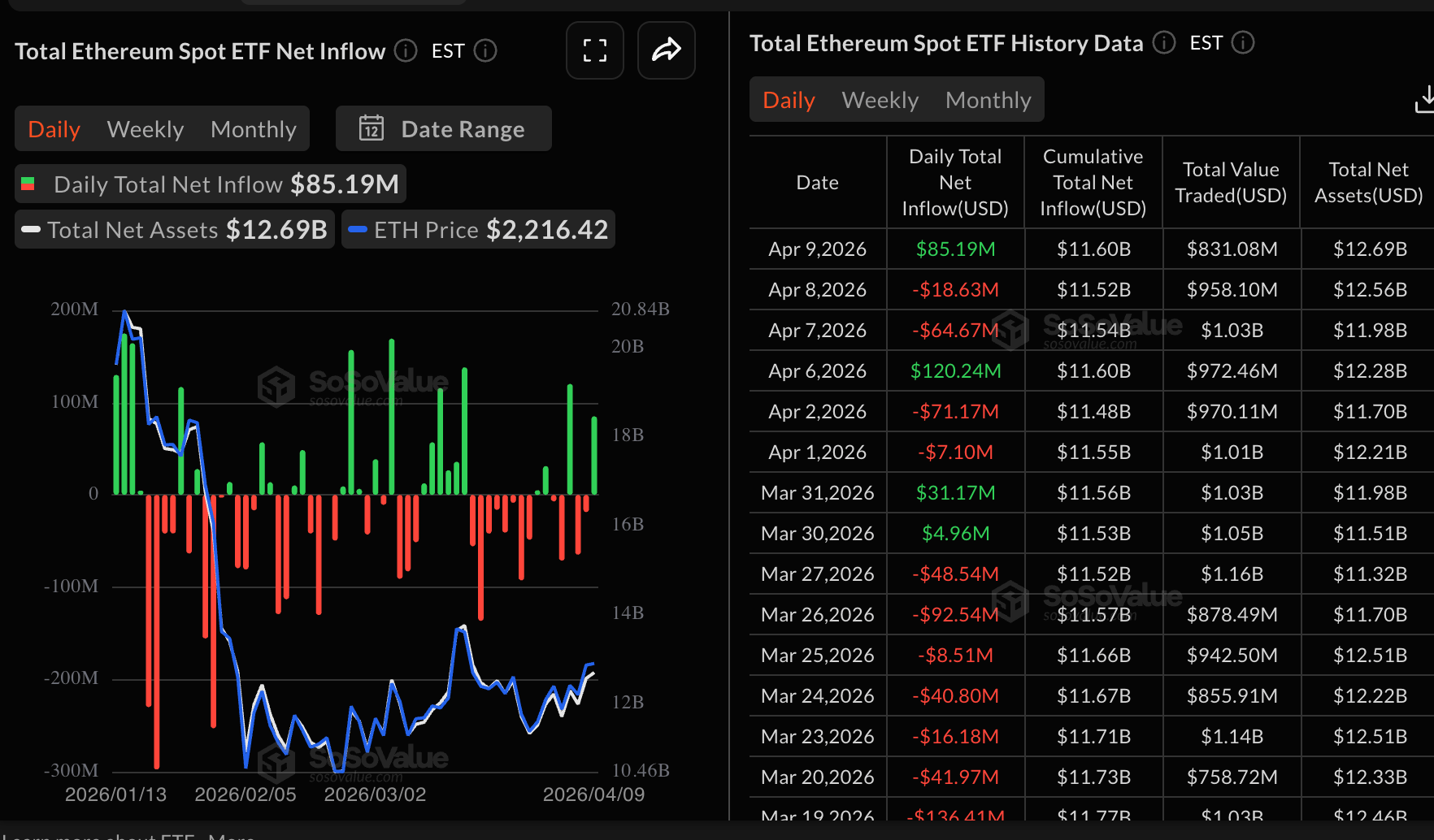 Ethereum spot ETFs, similarly, recorded inflows totaling $85 million on Thursday, breaking a two-day bearish streak, after seeing outflows of nearly $19 million on Wednesday and approximately $65 million on Tuesday. Cumulative inflows currently stand at $11.60 billion, with net assets under management averaging $12.69 billion.