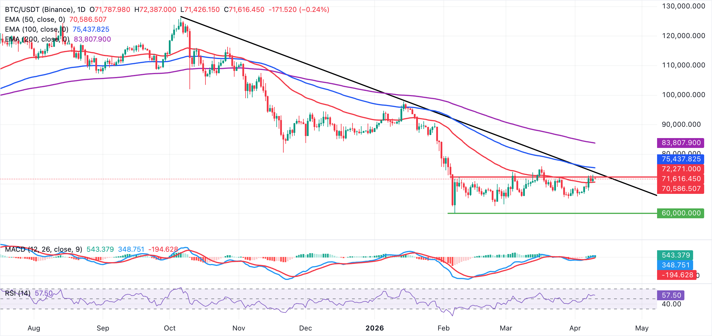 On the topside, Bitcoin's initial resistance is seen near the downward trendline around $73,830, which now serves as the first important barrier, followed by the 100-day EMA at $75,438 and then the more distant 200-day EMA at $83,808. On the downside, the 50-day EMA at $70,587 marks immediate support. A daily close beneath this floor would likely expose a deeper pullback below $70,000, while sustained trading above it would keep the door open for another attempt to challenge the $73,830 zone.