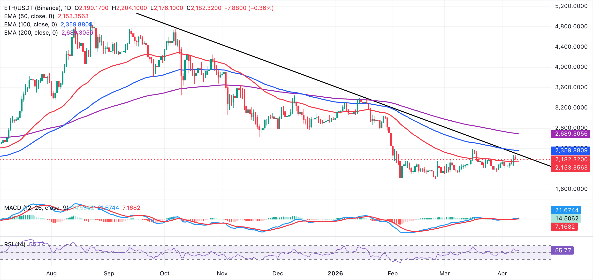 Ethereum trades at $2,182 at the time of writing on Friday, holding within a constrained outlook with the price sitting above the 50-day EMA at $2,153 but remains well beneath the 100-day EMA at $2,360 and the 200-day EMA at $2,689. This configuration suggests only a tentative recovery within a broader corrective phase, even as the MACD indicator holds in positive territory on the daily chart and the RSI near 56 hints at steady, but not overextended, bullish momentum.