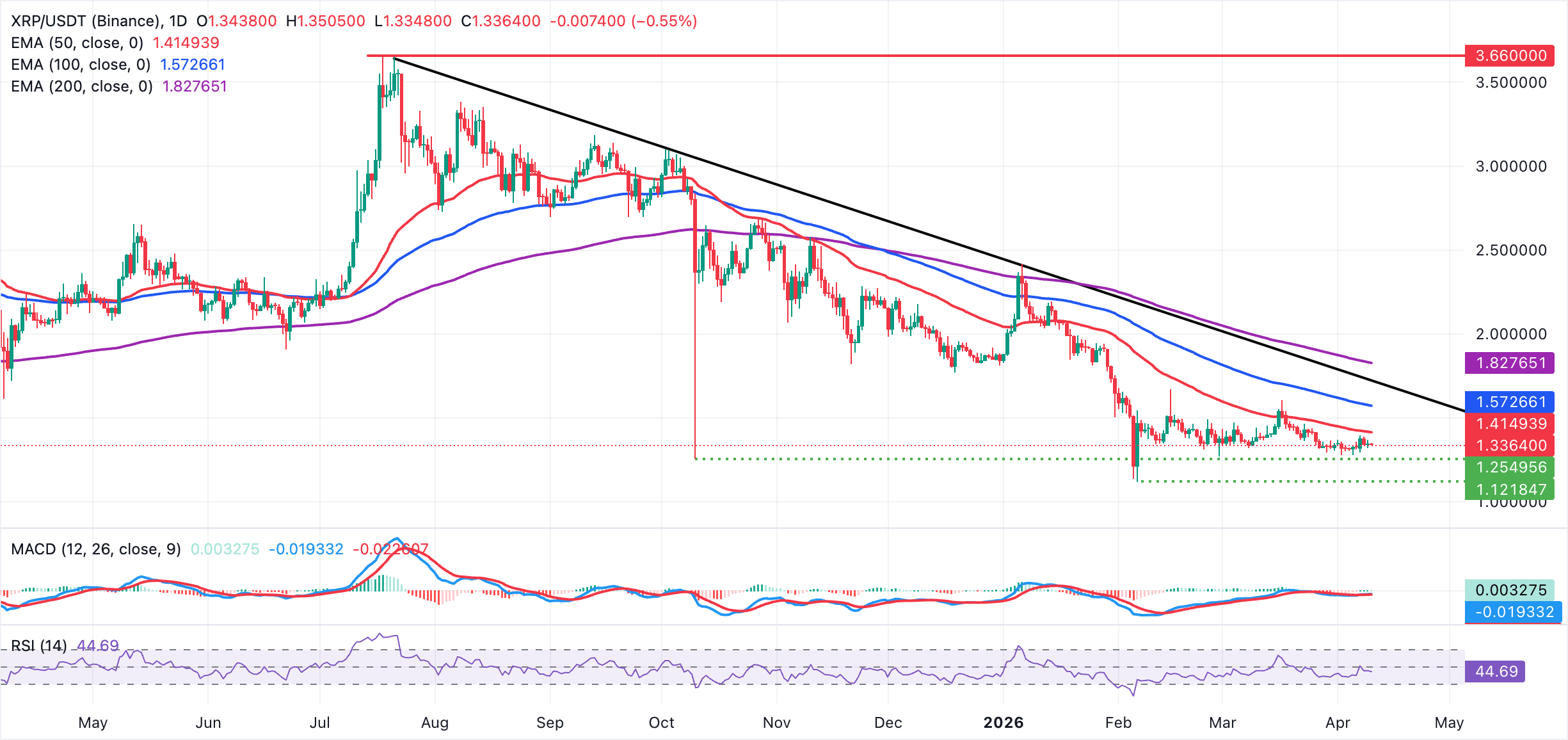 With no clear structural supports defined in the current dataset, failure to build a base above $1.33 would keep XRP vulnerable to further downside extension, leaving traders focused on how the price reacts to the nearby overhead EMAs to gauge whether the prevailing bearish structure can begin to ease.