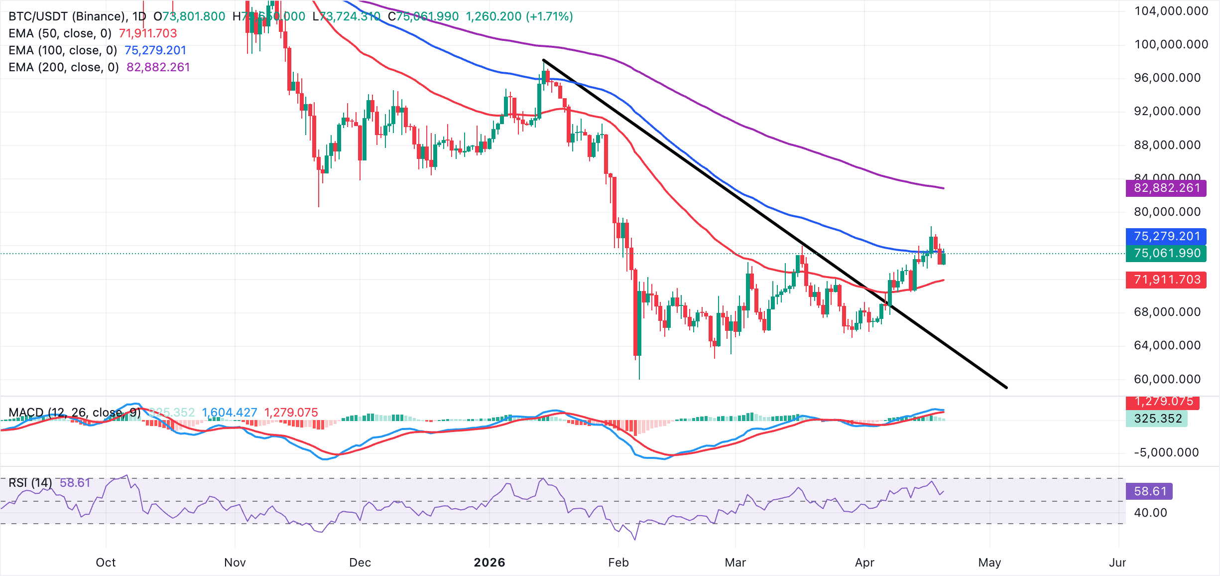 Bitcoin trades at $75,029, maintaining a constructive bullish bias as it holds above the 50-day exponential moving average (EMA) at $71,910. The price sits well above the broken downward trendline, which now serves as a deeper structural floor near $64,139. Still, price action is pressing into the 100-day EMA at $75,279, which represents immediate overhead supply, while the 200-day EMA, higher up at $82,882, defines a more distant cap to the advance.
