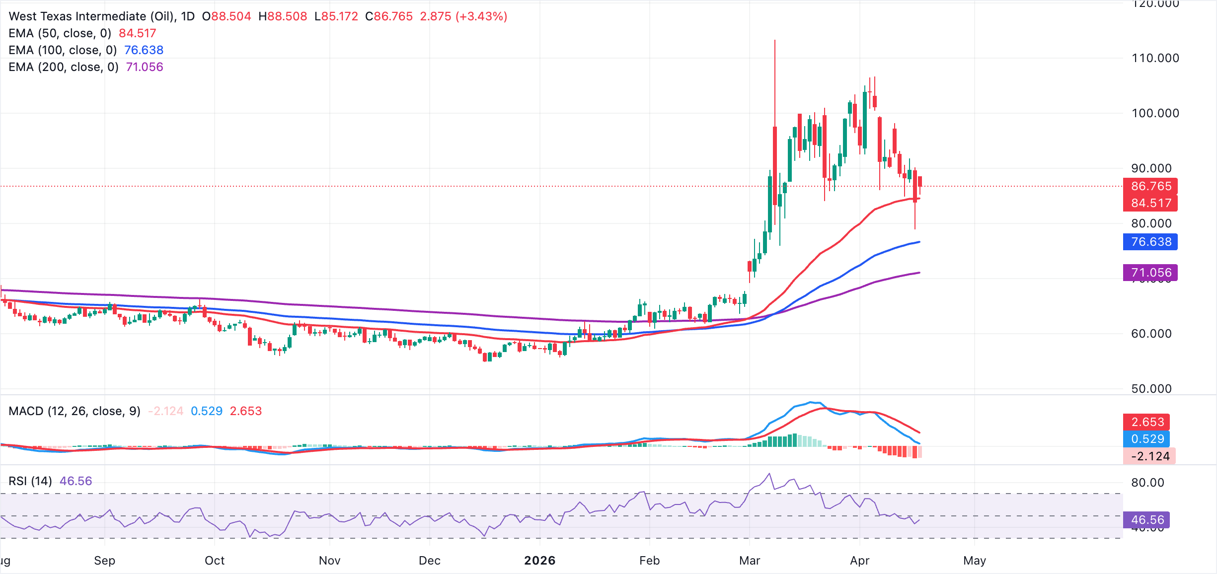 The West Texas Intermediary (WTI) Oil price is at $87 at the time of writing on Monday, up from the daily low of $85.17 and last week’s trough at $78.88.