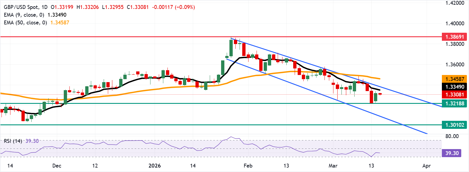GBP/USD inches lower after registering nearly 0.75 gains in the previous session, trading around 1.3310 during the Asian hours on Tuesday. The short-term bias stays mildly bearish as spot holds below the declining nine-day Exponential Moving Average (EMA) and now trades under the flatter 50-day EMA, signalling fading upside momentum. The recent sequence of lower closes from the 1.36 area and failure to reclaim the short-term average confirms that rallies remain vulnerable to renewed downside interest.