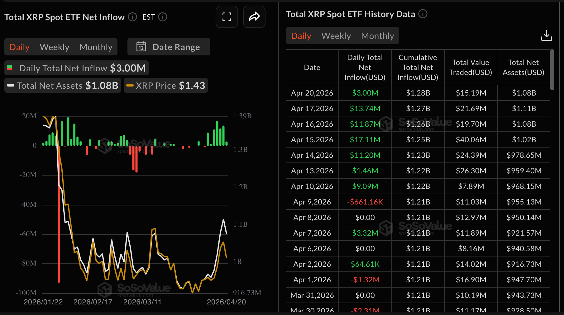 Meanwhile, institutional interest in related investment products has remained steady, as evidenced by XRP spot Exchange-Traded Funds (ETFs) attracting $3 million in inflows on Monday. This marked the seventh consecutive day of inflows since April 10, according to SoSoValue data.