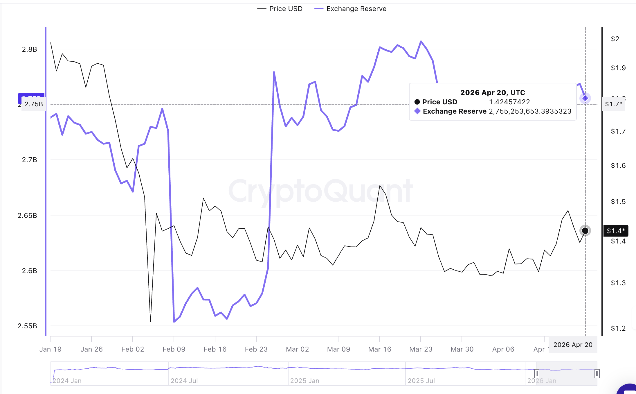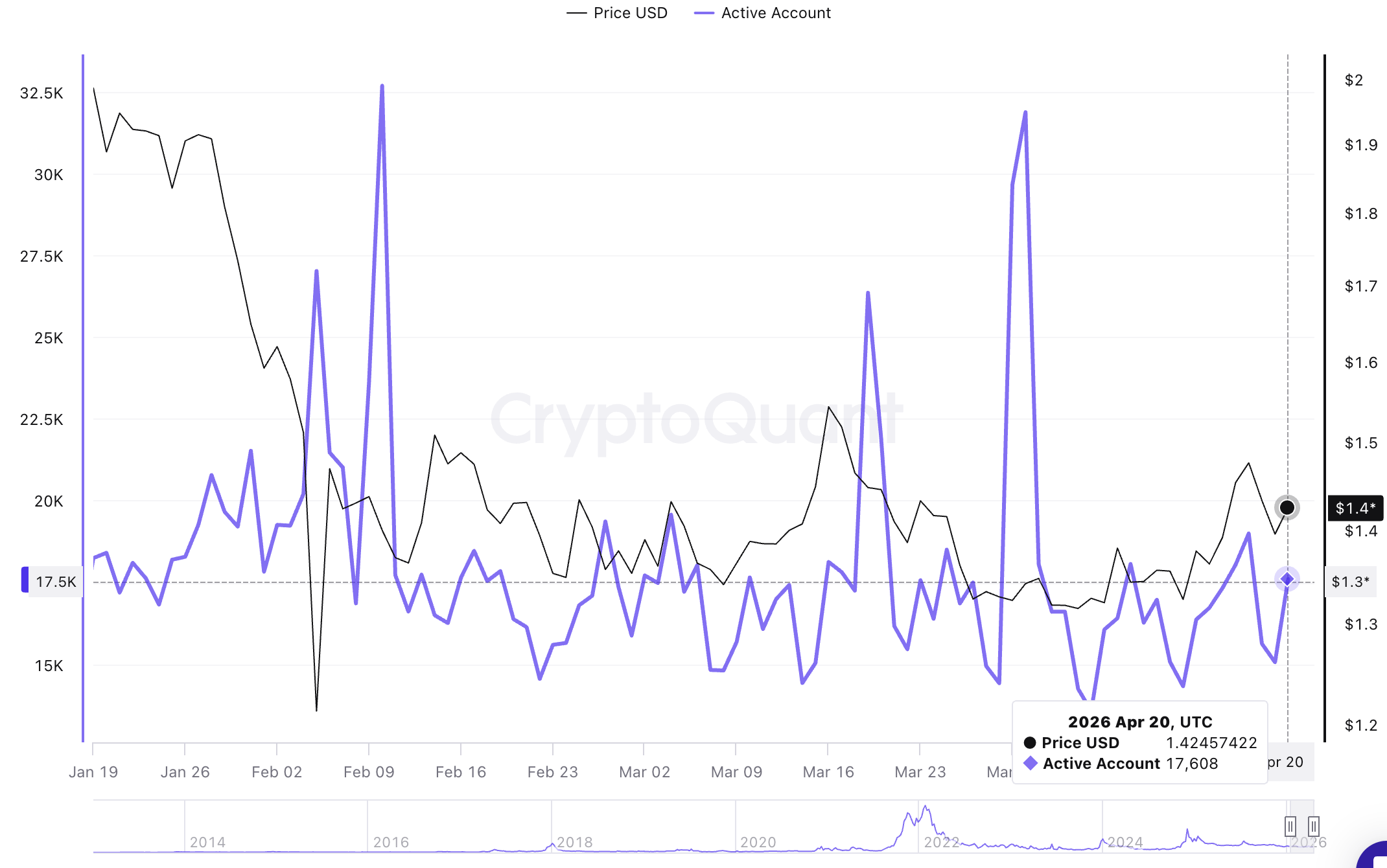 • XRP’s on-chain metrics show modest improvement, with the number of active addresses climbing to near 18,000 and Binance exchange reserves declining to 2.76 billion tokens.