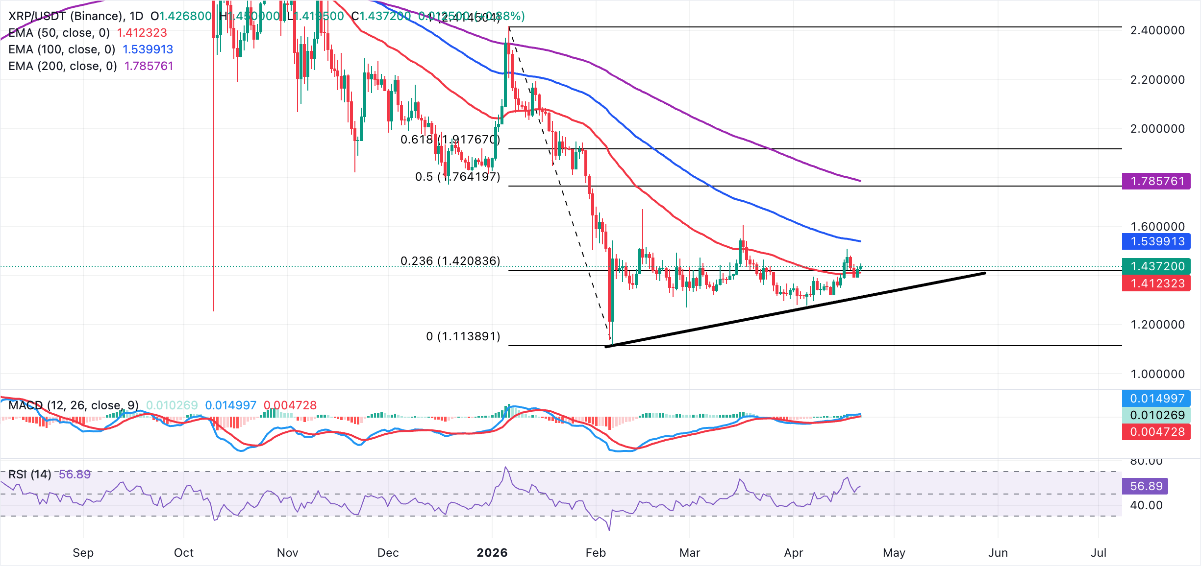 Ripple (XRP) shows signs of extending gains while trading above $1.43 at the time of writing on Tuesday. Several key support levels uphold the neutral-to-bullish bias, including the demand zone between $1.40 and $1.42.
