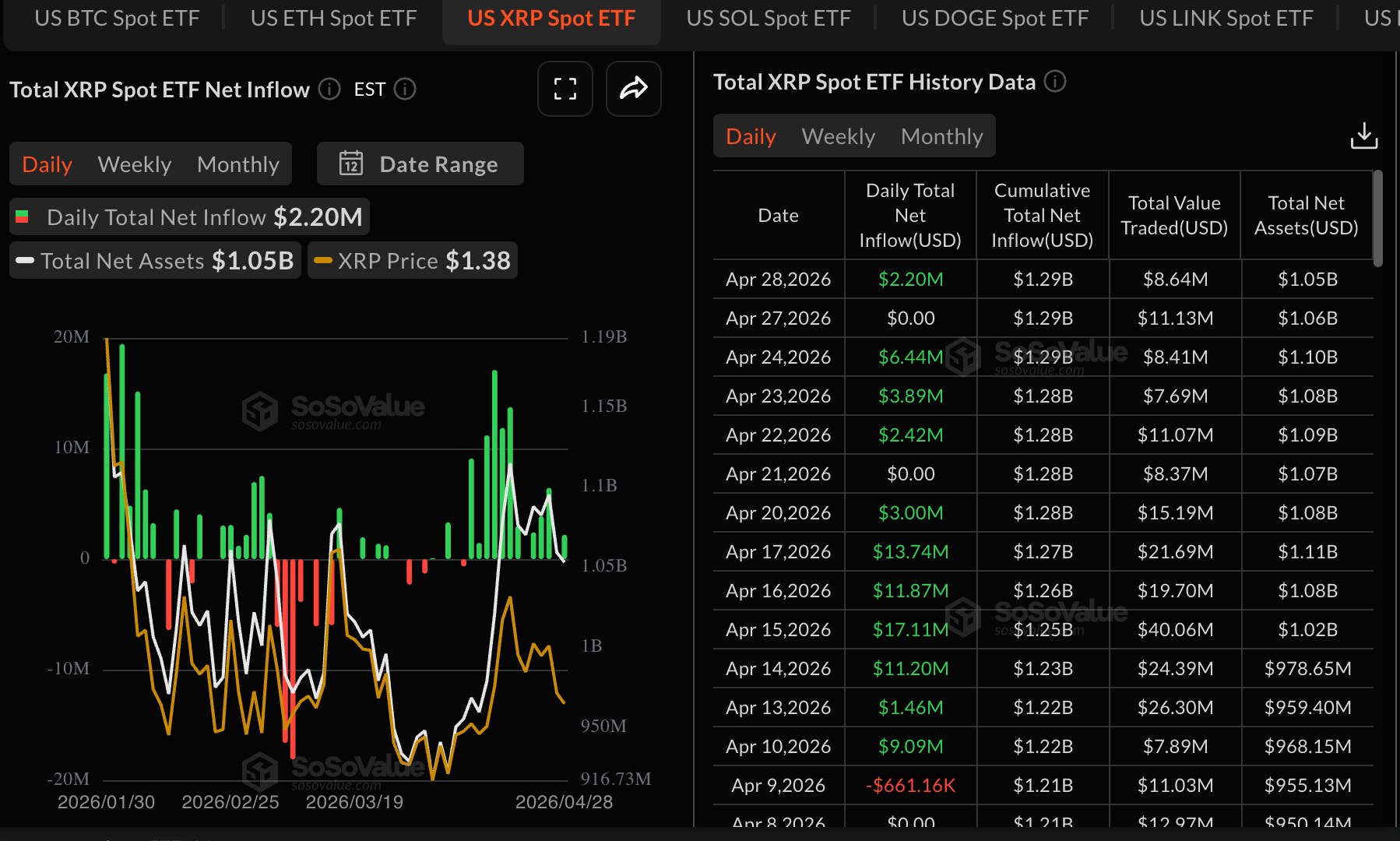 Institutional interest remains on the back foot across digital investment products, as seen with Bitcoin spot Exchange-Traded Funds (ETFs), which experienced outflows on Monday and Tuesday. However, XRP spot ETFs beat odds to posit mild inflows of $2.2 million on Tuesday, following muted activity on Monday, according to SoSoValue data.