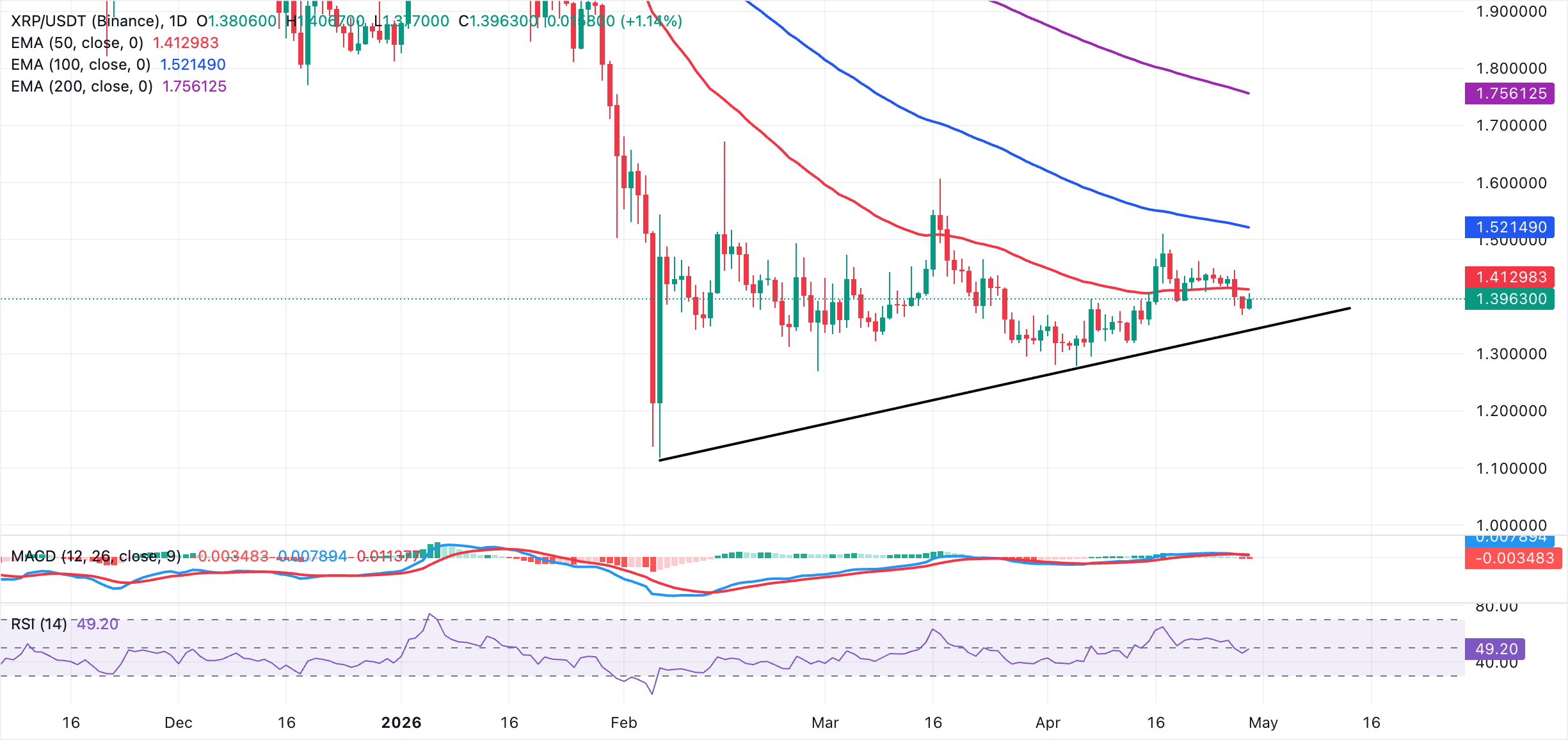 XRP trades above $1.39 as of writing on Wednesday. The upside remains capped in the short term, with price holding below the 50-day Exponential Moving Average (EMA) at $1.41 and well under the 100-day and 200-day EMAs at $1.52 and $1.76, respectively. Combined, the moving averages suggest a broader bearish structure despite the ongoing consolidation.