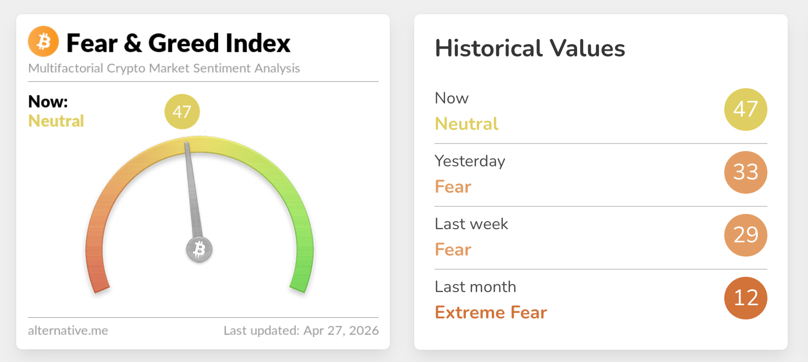 Broader market sentiment continues to improve with the crypto Fear & Greed Index holding at 47 in the fear territory on Monday, up from 33 the previous day. The index held in the extreme fear territory last month, underscoring the gradual but steady turnaround in investor risk appetite.