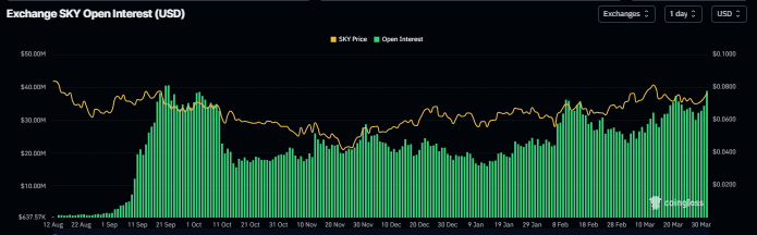 CoinGlass data shows that the futures’ OI in Sky at exchanges reaches $38.84 million on Tuesday, up from $30.10 million on Saturday and nearing its record high of $40 million. An increasing OI represents new or additional money entering the market and new buying, which could fuel the current SKY price rally.