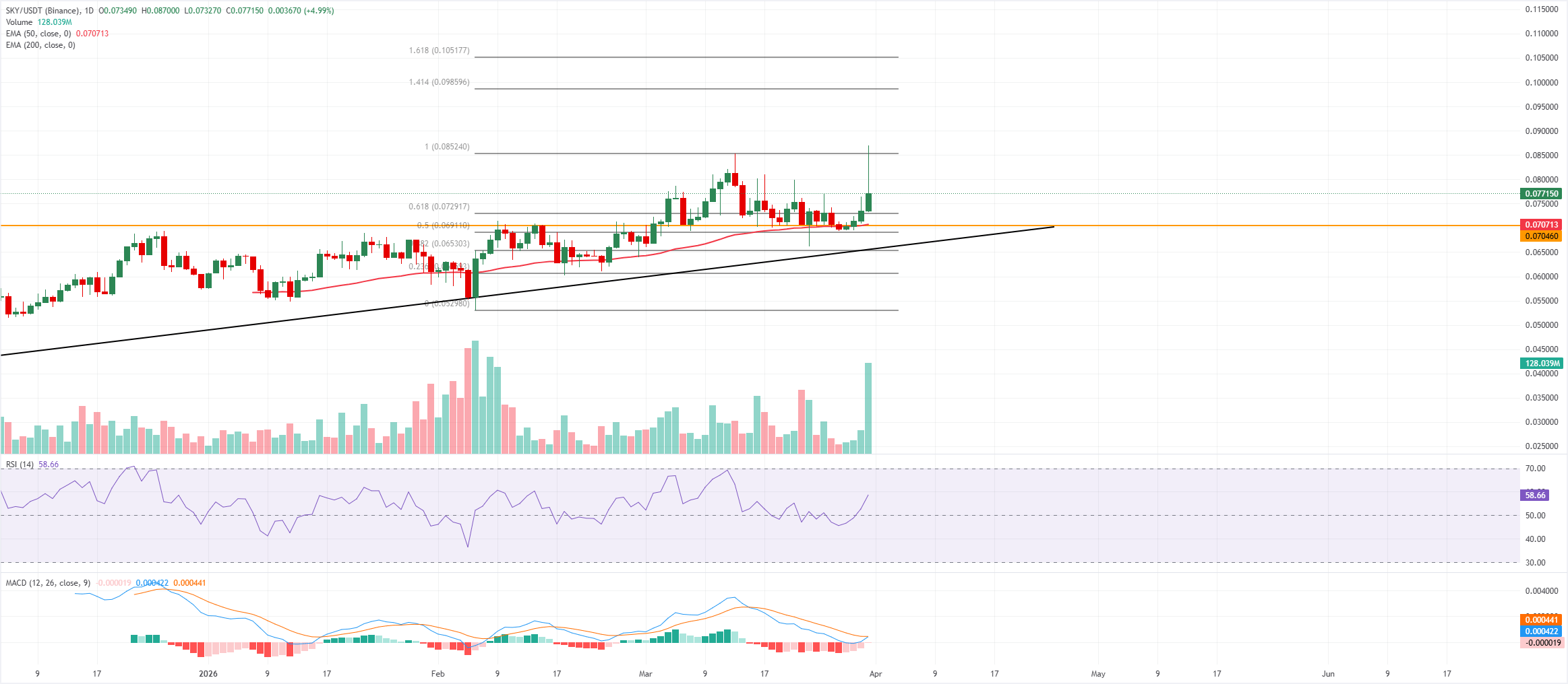 Sky price is trading above $0.077 on Tuesday. The near-term bias is bullish as price holds above the ascending trendline from $0.041 and trades north of the 50-day Exponential Moving Average (EMA) near $0.070, keeping the broader advance intact despite recent volatility.