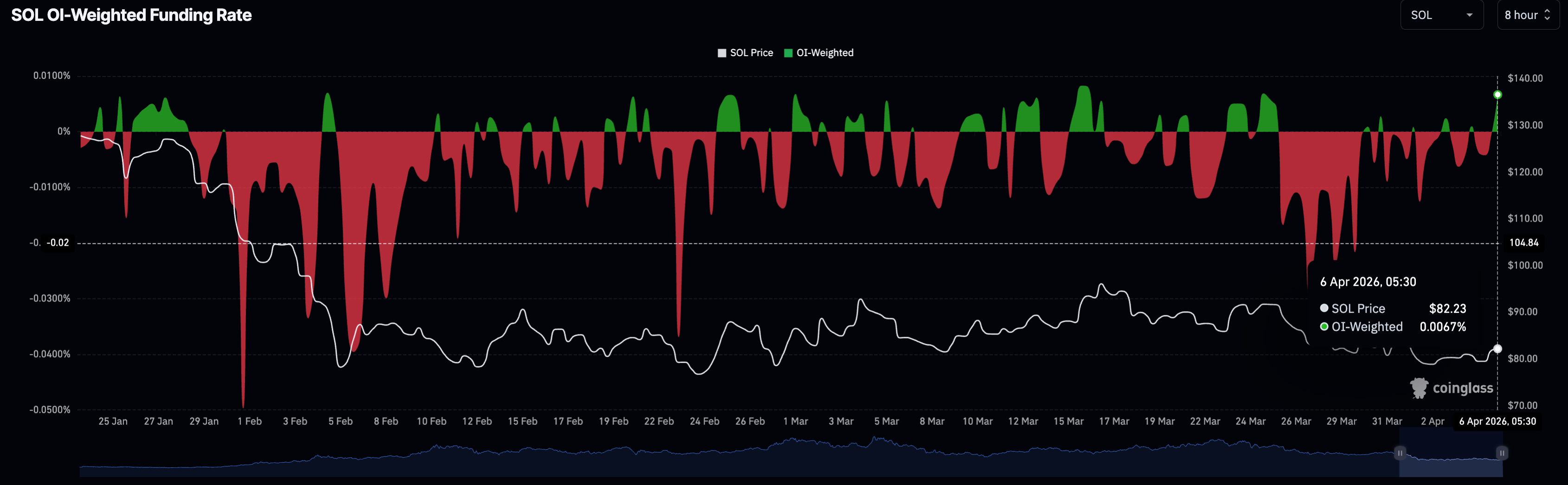Solana (SOL) hovers above $82 at press time on Monday, extending its recovery for the fourth day. A surge in funding rates of SOL futures amid declining Open Interest reflects mixed market sentiment. The technical outlook puts focus on the 50-day Exponential Moving Average (EMA) at $88.80 as the primary resistance.