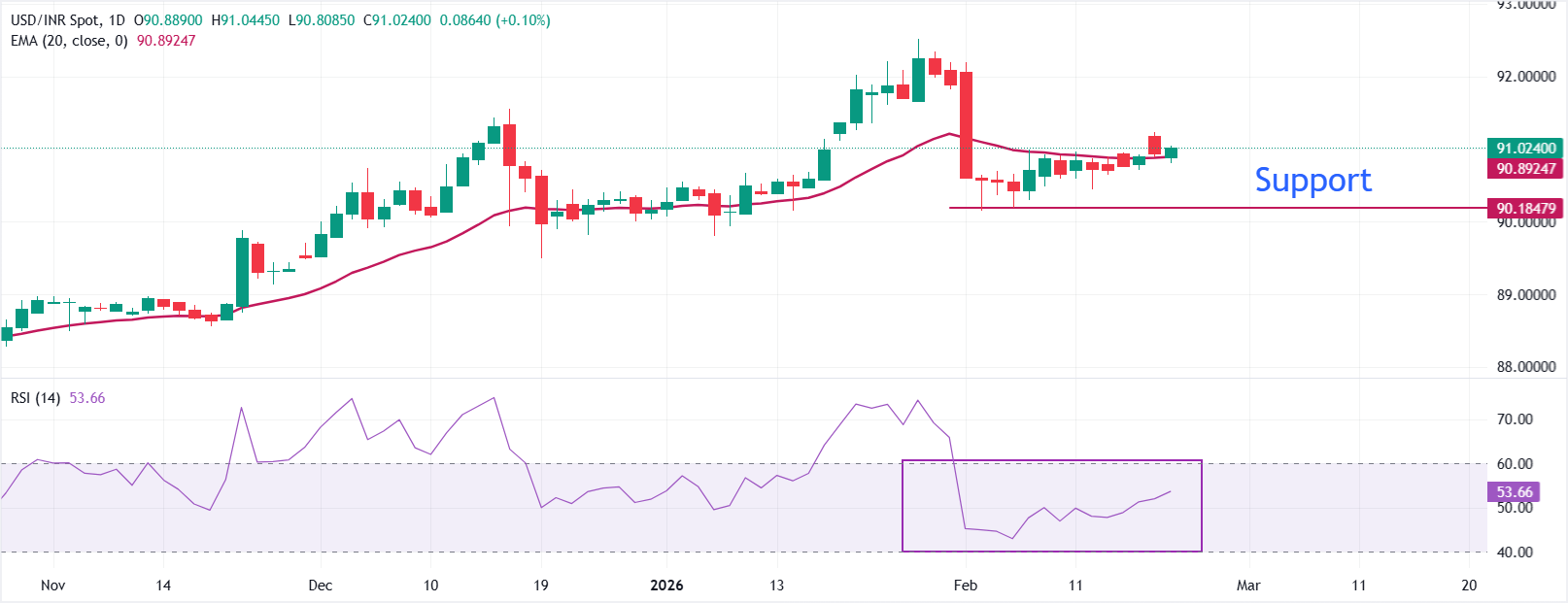 美元/印度卢比在当前时刻上涨至接近91.00。价格保持在90.888的20日指数移动平均线(EMA)之上,尽管该平均线在最近的下行后趋于平坦,显示出盘整信号。EMA的轻微上升表明现货下方正在形成初步支撑。