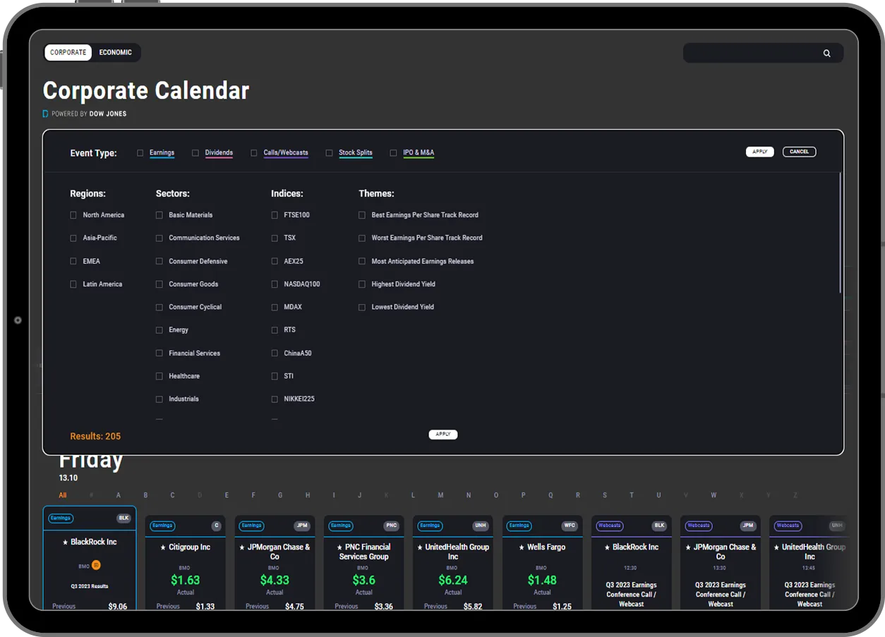 Easily explore upcoming corporate events such as earnings, dividends, stock splits, IPOs and mergers and acquisitions.