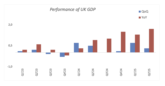 英国经济在截至2025年9月的三个月内以季度增长0.1%扩张,第二季度(Q2)增长为0.3%。