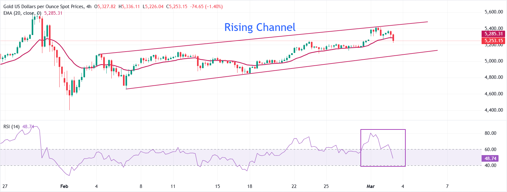XAU/USD在此时滑落至5200美元以下。短期偏向中性,向下倾斜,因为价格从接近5400美元的上升通道模式的上边界回落,并滑向20期指数移动平均线(EMA),该线在5280美元附近交易。