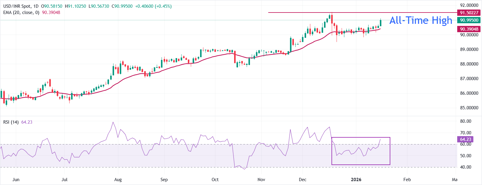 截至撰写时,美元/印度卢比飙升至接近91.15。20日指数移动平均线(EMA)正在上升,并继续支撑这一上涨。价格走势保持在这一动态指标之上,限制了回调。