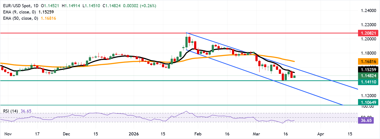 欧元/美元在周四亚洲交易时段恢复了前一交易日的损失,徘徊在1.1490附近。日线图技术分析表明,由于该货币对在下降通道模式中向下移动,持续存在看跌偏向。