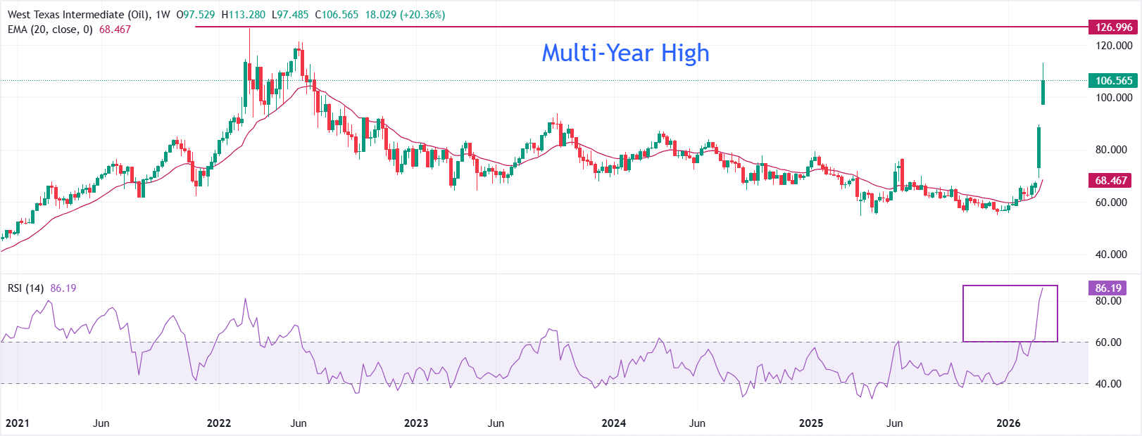 WTI美国原油在周一创下约113.00美元的三年半新高。短期偏向看涨,因为价格稳稳高于10周指数移动平均线(EMA),该均线正在上升,目前接近74.25美元,强调了强劲的上涨延续。最新的周线蜡烛图标志着在均线下方的长期盘整后的加速阶段,确认了有利于买家的趋势转变。