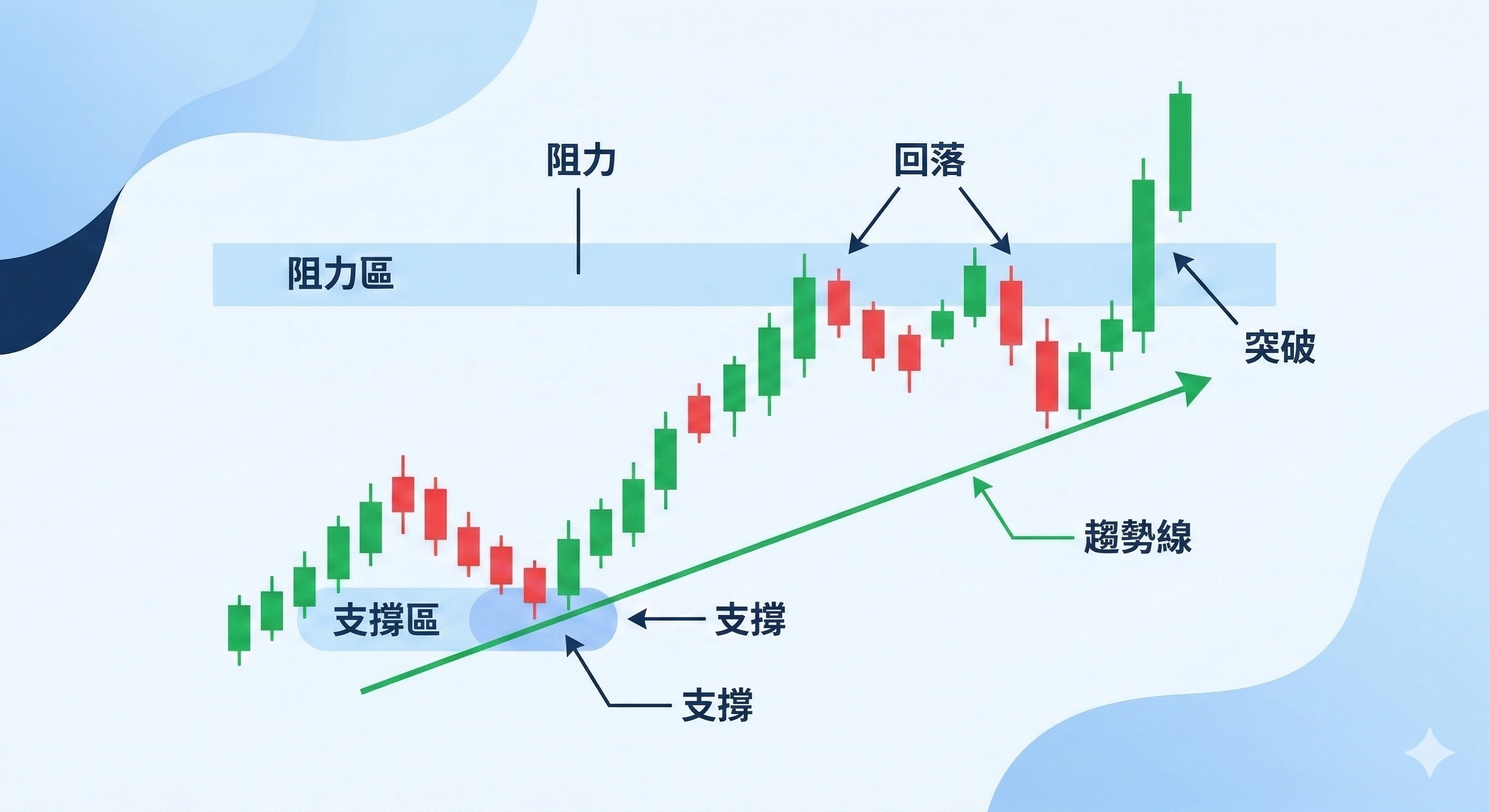 支撐與阻力是價格在特定區域內較容易止跌或受壓的區間。支撐通常代表買盤較容易進場的位置,阻力通常代表賣壓較容易增加的位置。支撐與阻力不是單一精準點位,而比較常是價格區域。交易者常用前波高低點、移動平均線、趨勢線與整數關卡來辨識支撐與阻力,並用來觀察反彈、回落、突破與跌破。