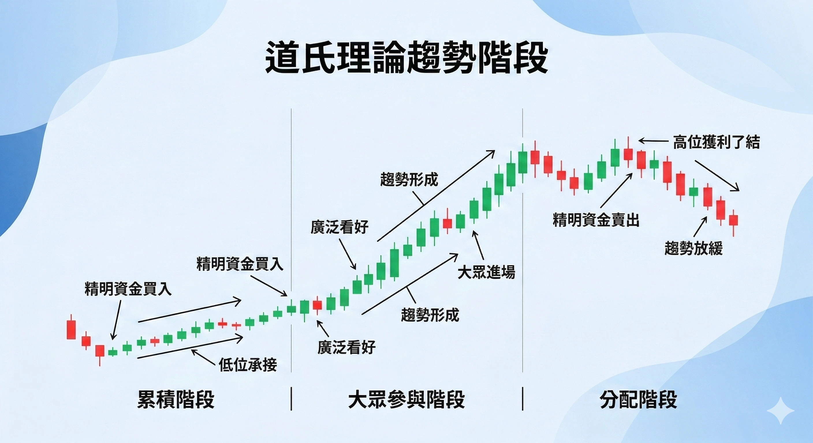 道氏理論的趨勢階段,主要看累積階段、大眾參與階段與分配階段這三個階段。這三個階段能幫助交易者理解趨勢是如何形成、擴大與結束的。