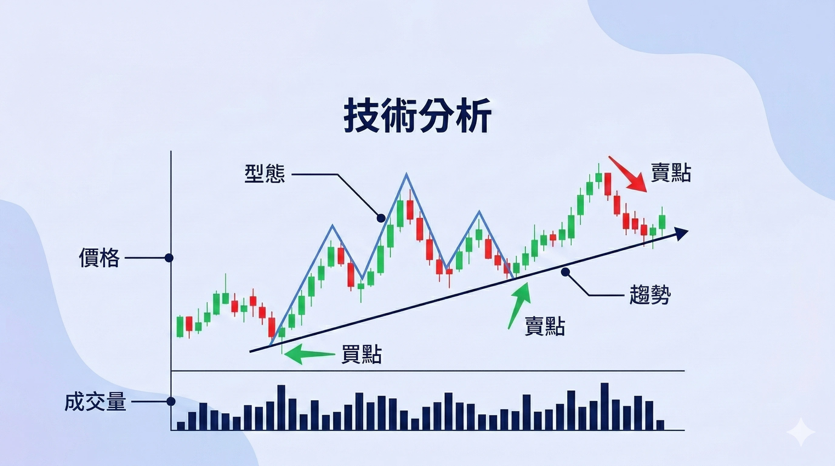 技術分析(Technical Analysis)是透過研究歷史價格、成交量與圖表型態,來預測未來價格趨勢與決定交易策略的方法。它建立在三個核心假設之上,分別是市場行為反映一切、價格依趨勢移動,以及歷史會重演。交易者常用 K 線圖、支撐與阻力、趨勢線、型態學與技術指標,來判讀市場方向與買賣時機。