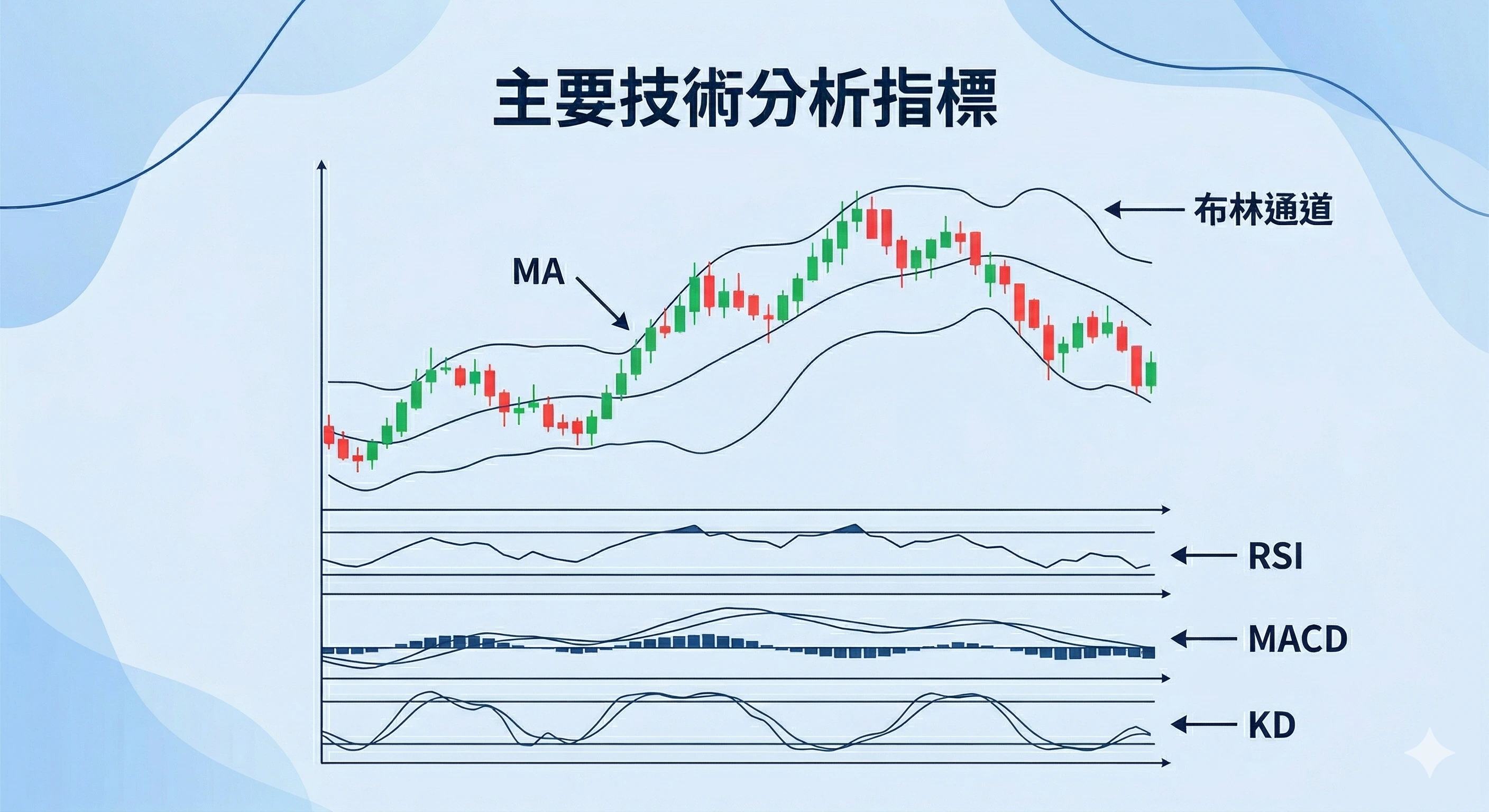 技術分析指標主要有 5 種常見類型,分別是移動平均線、相對強弱指標、平滑異同移動平均線、KD 指標與布林通道。這些指標都是根據價格與成交量資料計算而來,用來協助交易者判斷趨勢、動能、超買超賣與波動區間。技術分析指標的角色是輔助判讀,不是單獨決定交易的唯一依據。