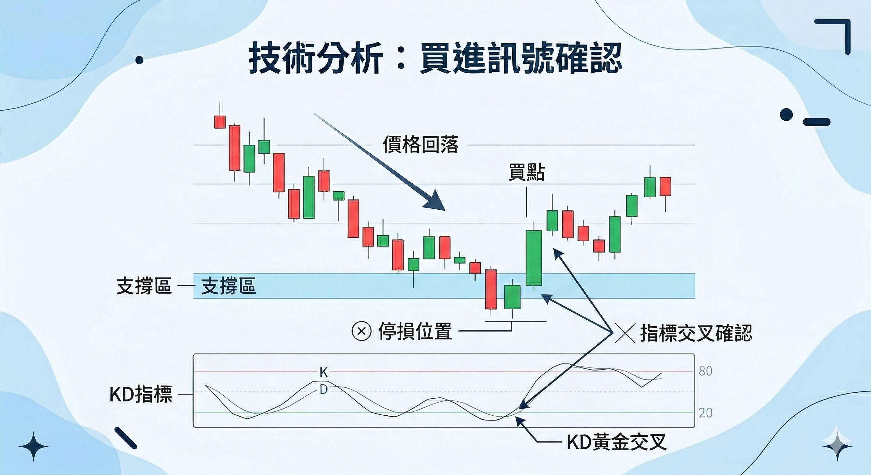 技術分析能提供較明確的買賣訊號。K 線、均線、KD、趨勢線與支撐阻力,都能幫助交易者判斷進場點、出場點與停損位置。交易者可先設定條件,再依照條件執行,這樣能減少情緒干擾,並提高交易紀律。實際判讀時,交易者通常會先看趨勢方向,再看支撐與阻力位置,最後用 K 線或技術指標確認訊號是否成立。
