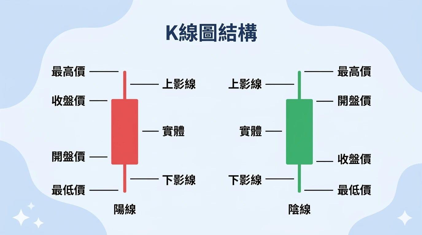 K 線圖是記錄一段時間內開盤價、最高價、最低價與收盤價的技術分析圖表。K 線圖之所以重要,是因為它能用實體與上下影線,直接呈現多空力量變化。紅 K 通常代表收盤高於開盤,黑 K 或綠 K 通常代表收盤低於開盤。交易者可以透過 K 線的長短、位置與組合,判斷市場情緒、趨勢強弱與可能的反轉訊號。